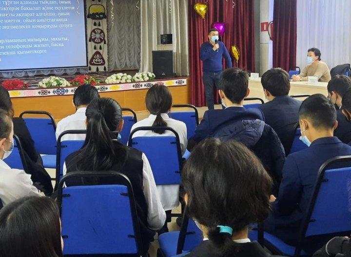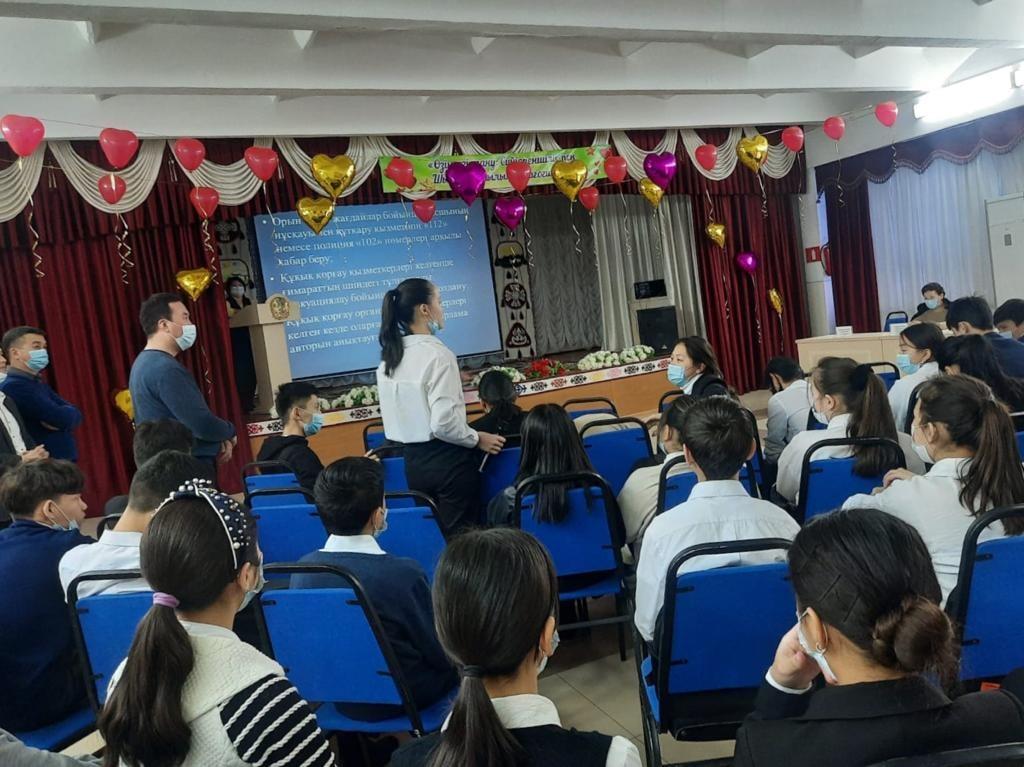 2022 жылдың 8 ақпан күні "Құқықтық білім беру" айлығының іс-шаралар жоспарына сәйкес мектебіміздің 9 сынып жетекшілері К. Сүгіров, Ж. Байлиева, М. Әуесбек, Р. Бағланұлы және А. Мамешованың ұйымдастыруымен оқушылардың құқықтық сауаттылығын арттыру, мәдениетін қалыптастыру мақсатында жас өскелең ұрпақтың тәртіпсіздіктерге ермеу, құқық бұзушылық әрекеттерге бармау жөнінде жоғары сынып оқушыларына Тараз қаласы әкімдігінің мәдениет және тілдерді дамыту бөлімі басшысының орынбасары, #10 Мобильдік топ мүшесі Абашова Кәмиля Жүрсінәліқызының қатысуымен түсіндіру жұмыстары жүргізілді. Кездесу барысында тақырыпқа байланысты бейнероликтер мен слайдтар көрсетілді.