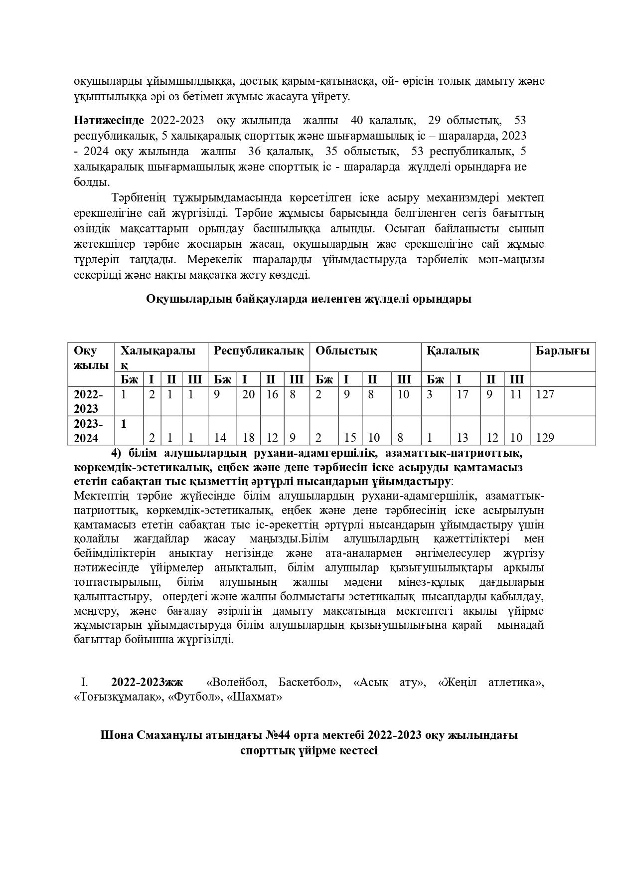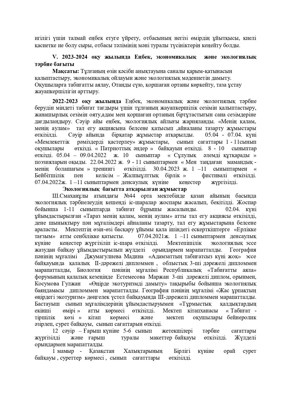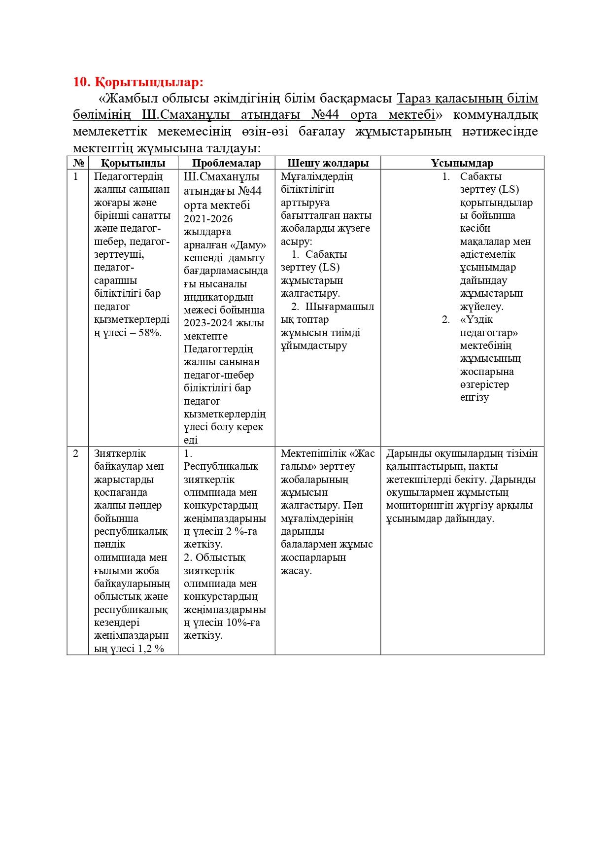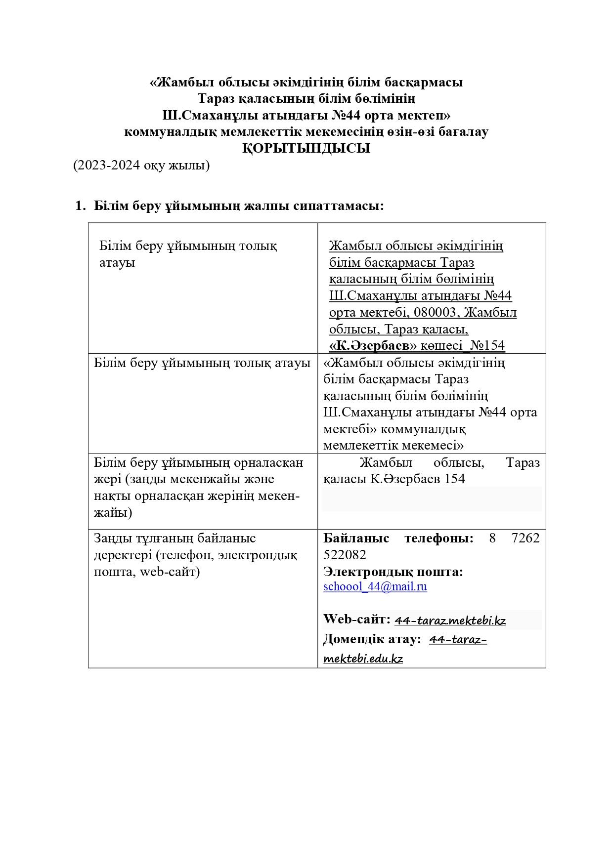 «Жамбыл облысы әкімдігінің білім басқармасы Тараз қаласының білім бөлімінің Ш.Смаханұлы атындағы №44 орта мектеп» коммуналдық мемлекеттік мекемесінің өзін-өзі бағалау ҚОРЫТЫНДЫСЫ » СШ №44