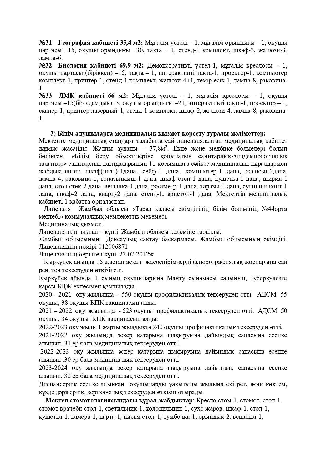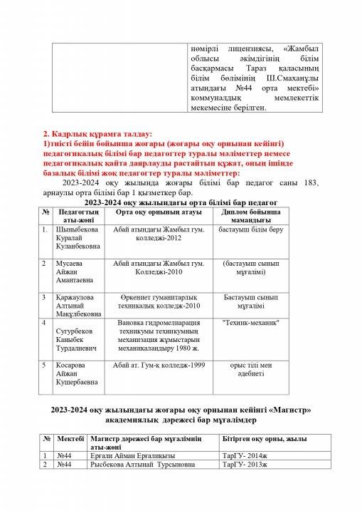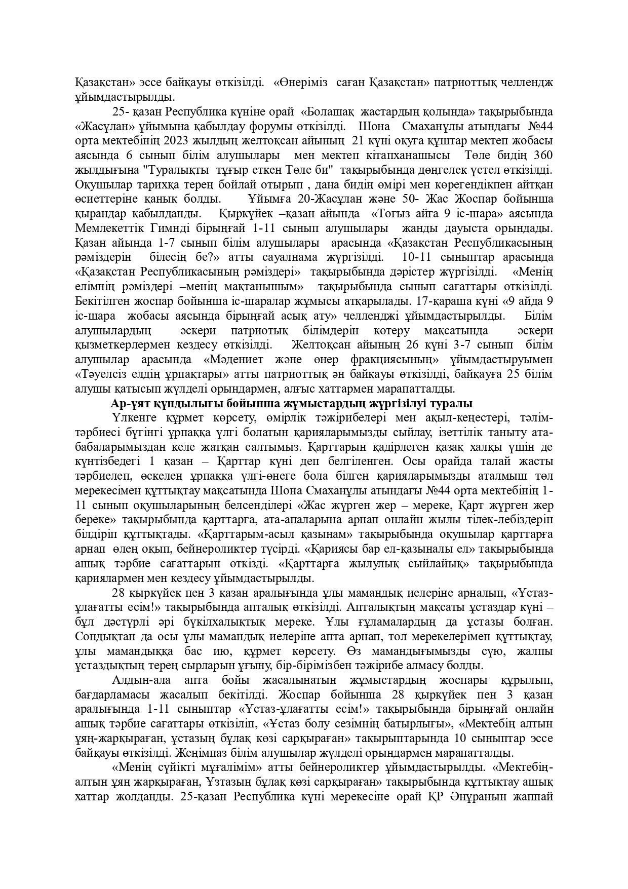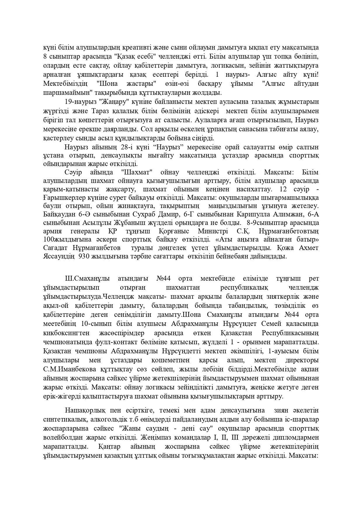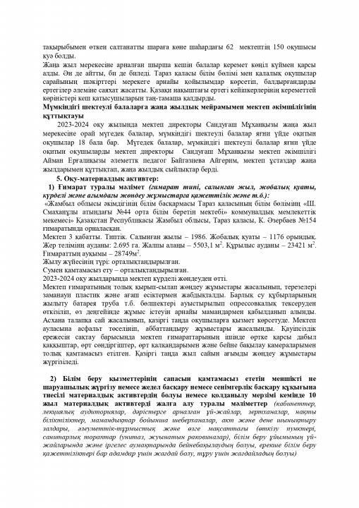 «Жамбыл облысы әкімдігінің білім басқармасы Тараз қаласының білім бөлімінің Ш.Смаханұлы атындағы №44 орта мектеп» коммуналдық мемлекеттік мекемесінің өзін-өзі бағалау ҚОРЫТЫНДЫСЫ
