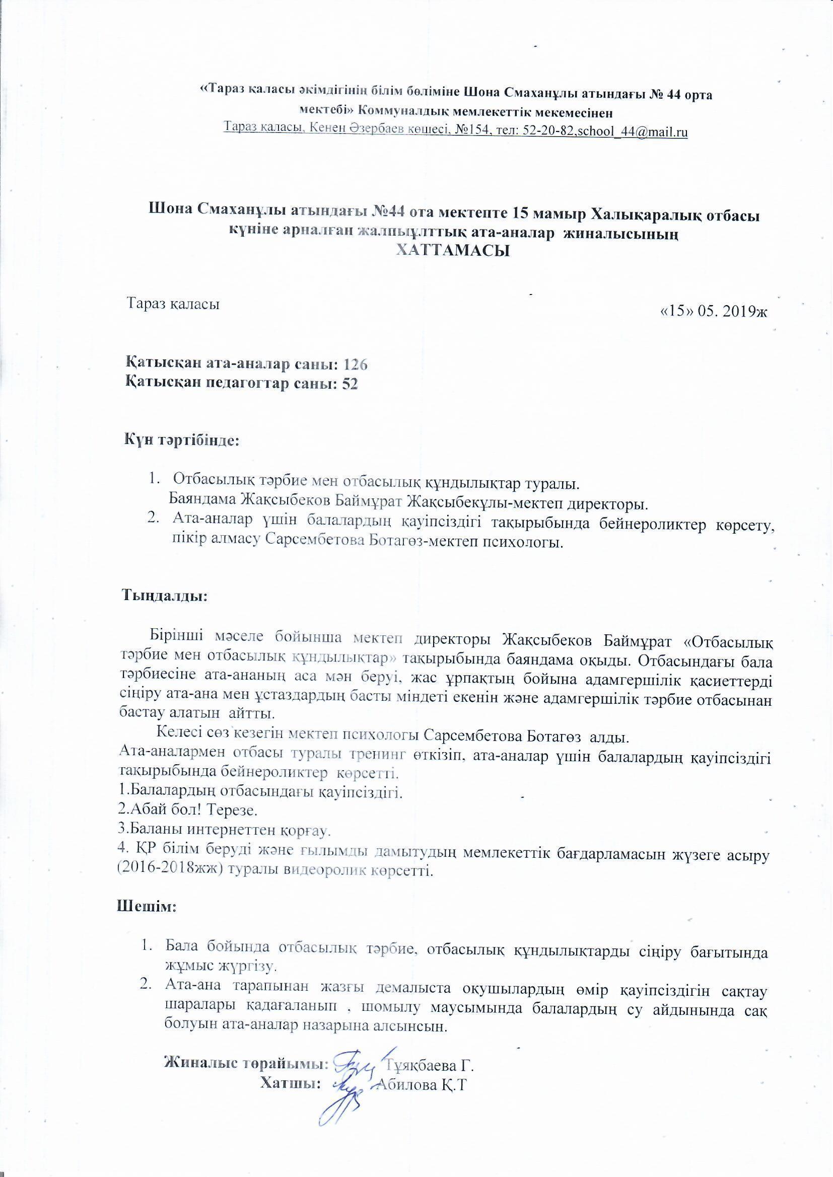 Шона Смаханұлы атындағы №44 орта мектебінде Халықаралық отбасы күніне орай ата-аналар жиналысы өтті. Жиналыста ата-аналарға "Балалардың отбасындағы қауіпсіздігі", "Абай бол терезе", "Балаларды интернеттен қорғау", "ҚР білім беруді ғылымды дамытудың мемлекеттік бағдарламасын жүзеге асыру" тақырыптарында видеороликтер көрсетілді.