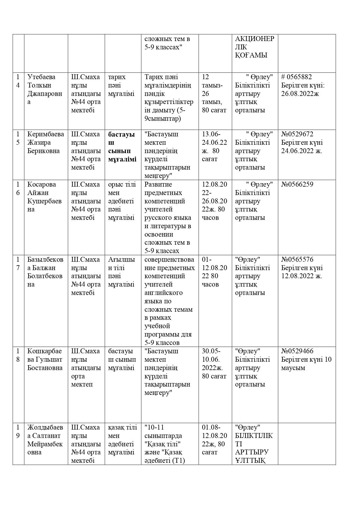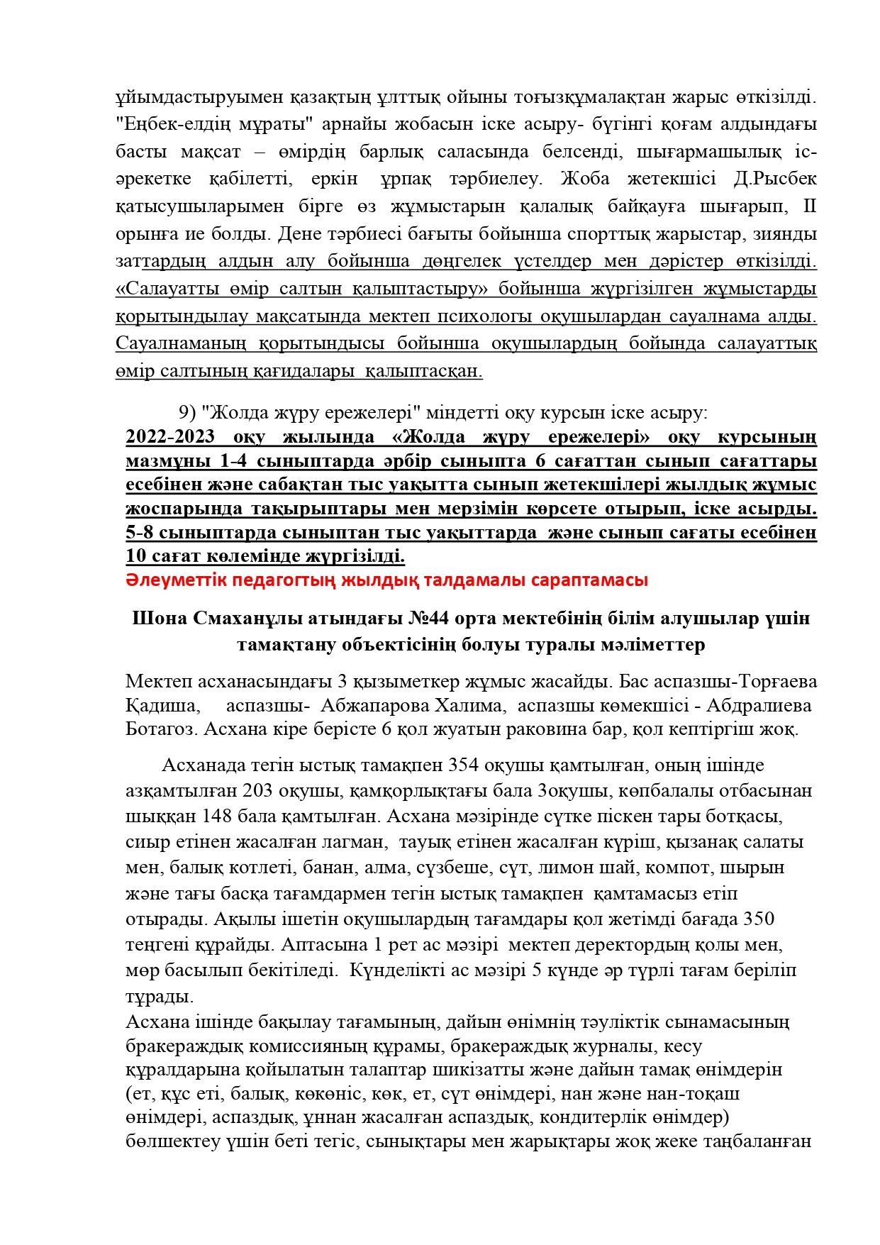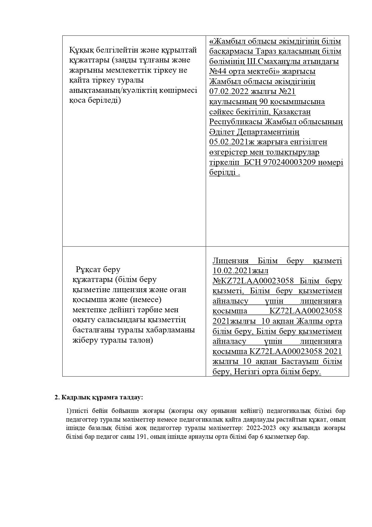 «Жамбыл облысы әкімдігінің білім басқармасы Тараз қаласының білім бөлімінің Ш.Смаханұлы атындағы №44 орта мектеп» коммуналдық мемлекеттік мекемесінің өзін-өзі бағалау ҚОРЫТЫНДЫСЫ