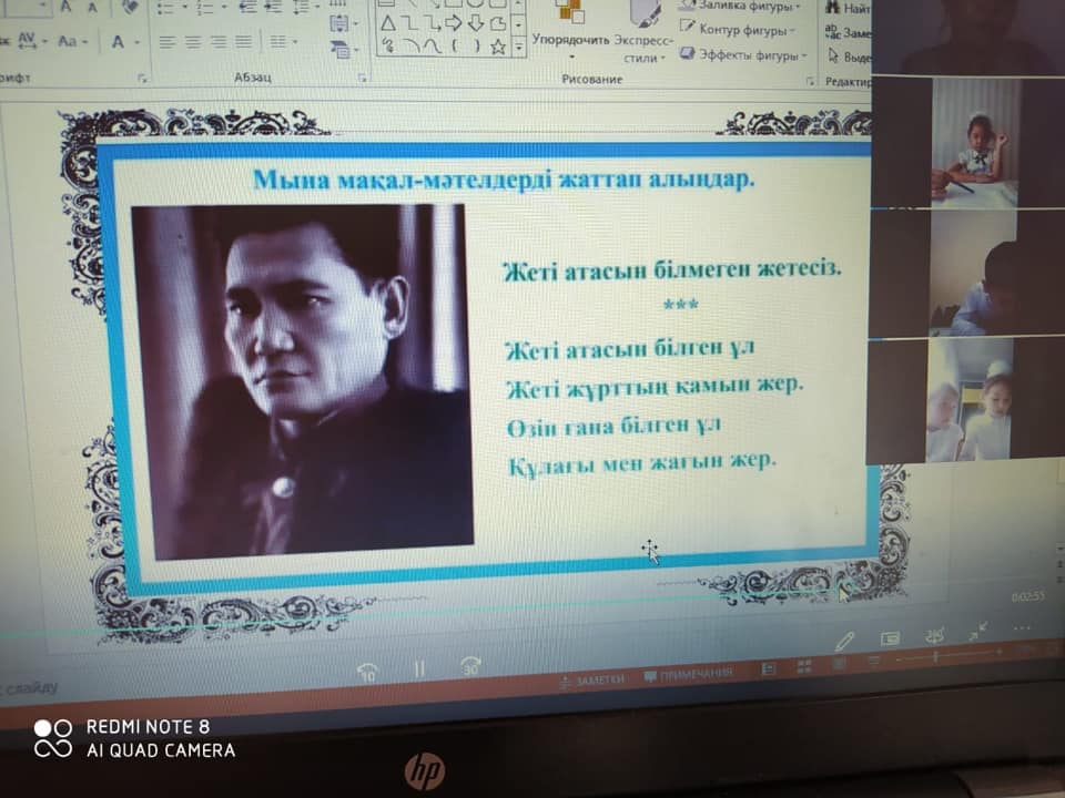 Рахманбердиева Жадыра Қуанышбекқызы педагог- модератор 2 "В" сыныбымен әдебиеттік оқу пәнінен "Жеті атамды білемін. Б. Момышұлы. Елтанудың басы" тақырыбында ашық сабақ өтті. Ашық сабақ синхронды және асинхронды түрде өтті. Үй тапсырмасын қайталау мен жаңа сабақ түсіндіру синхронды түрде зум платформасында өтілді. Дәптермен жұмыс, сабақты меңгерту, кері байланыс асинхронды түрде болды.