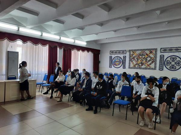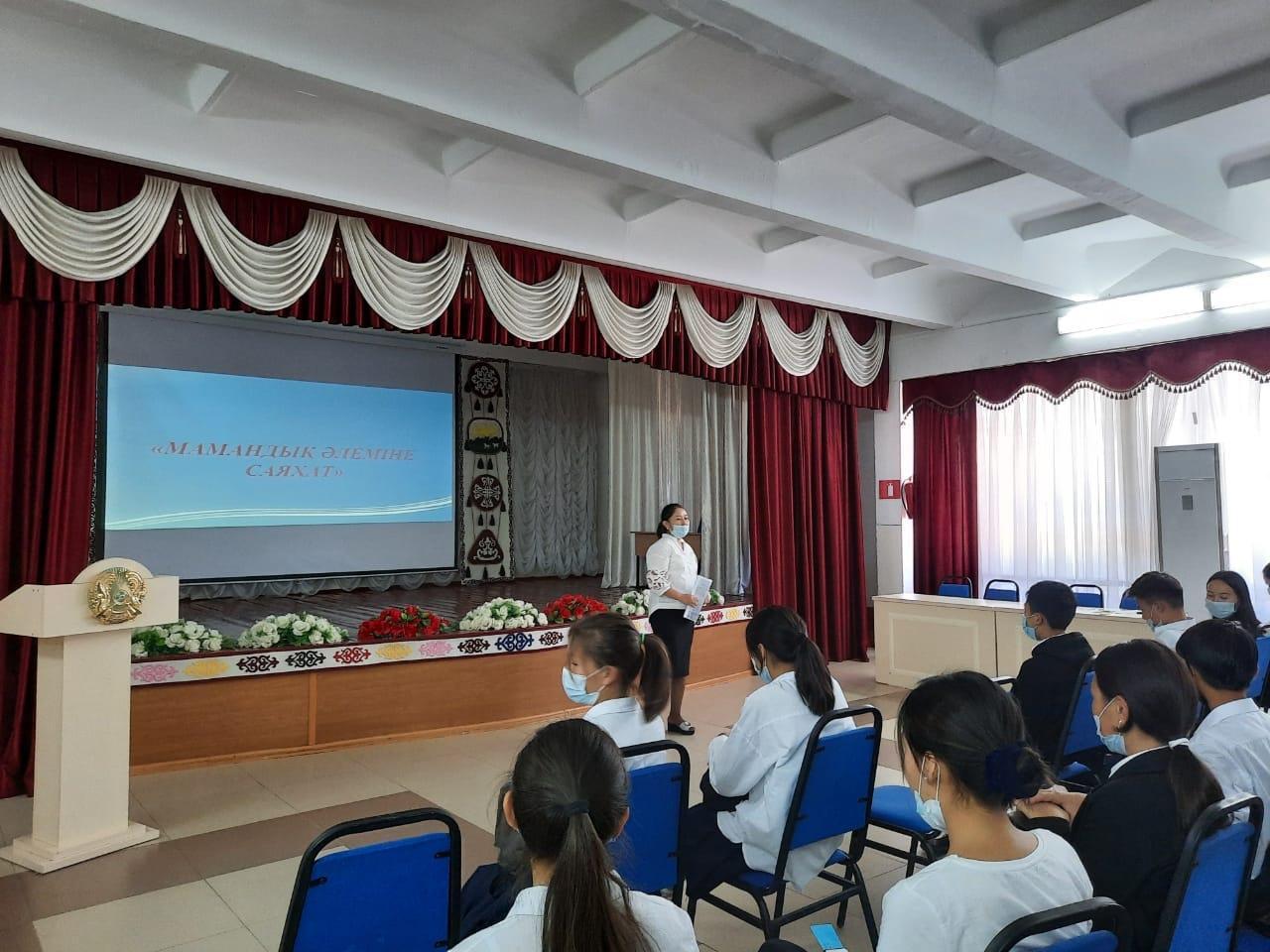 Білім алушыларға мамандықтың түрлері, олардың адам өміріндегі маңызы туралы түсінік бере отырып, өз бейіміне сәйкес мамандық таңдай білуіне ықпал жасау, кәсіби бағдар беру, түрлі жаттығулар арқылы таным процестерін дамыту, өз пікірін еркін айтып, өзгенің пікірін сыйлай білуге, жүйелі ойлауға баулу мақсатында 9 сынып білім алушыларына мектеп психологтары "Мамандық әлеміне саяхат" тақырыбында тренинг өтті.