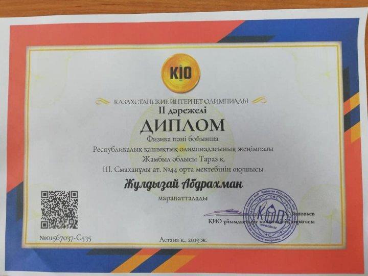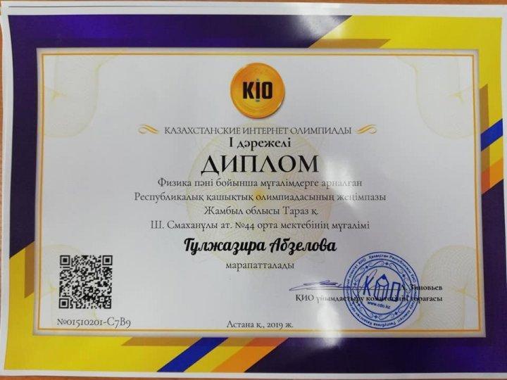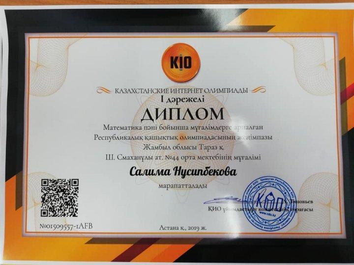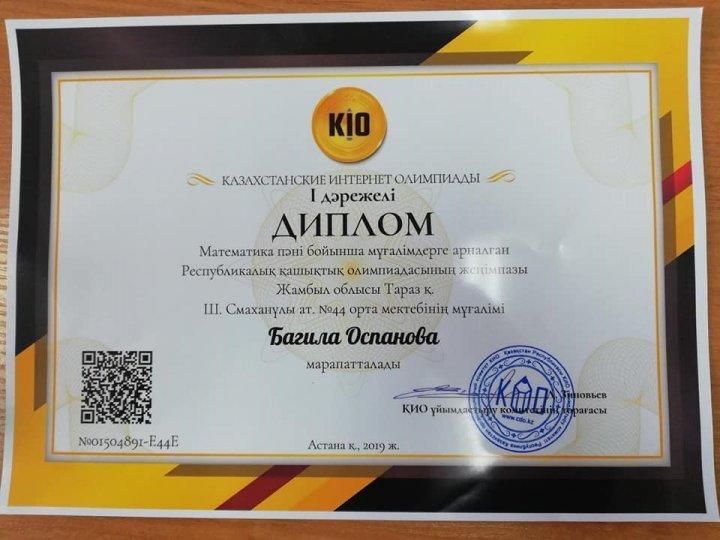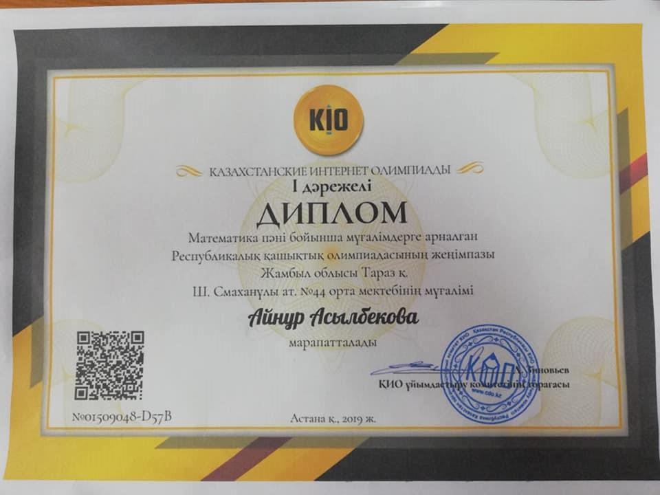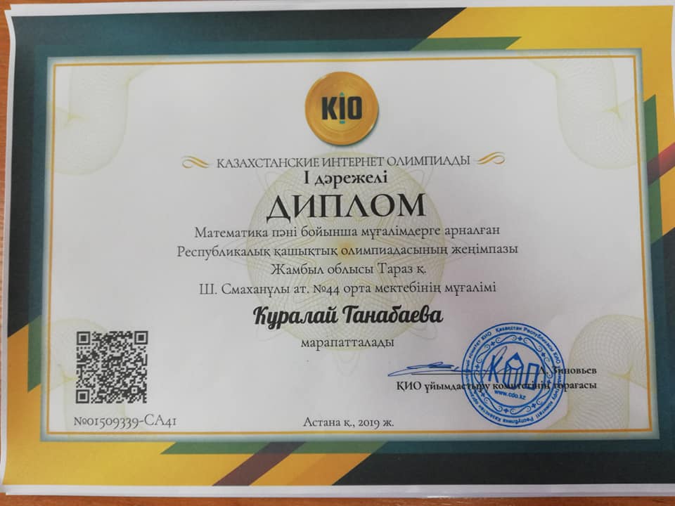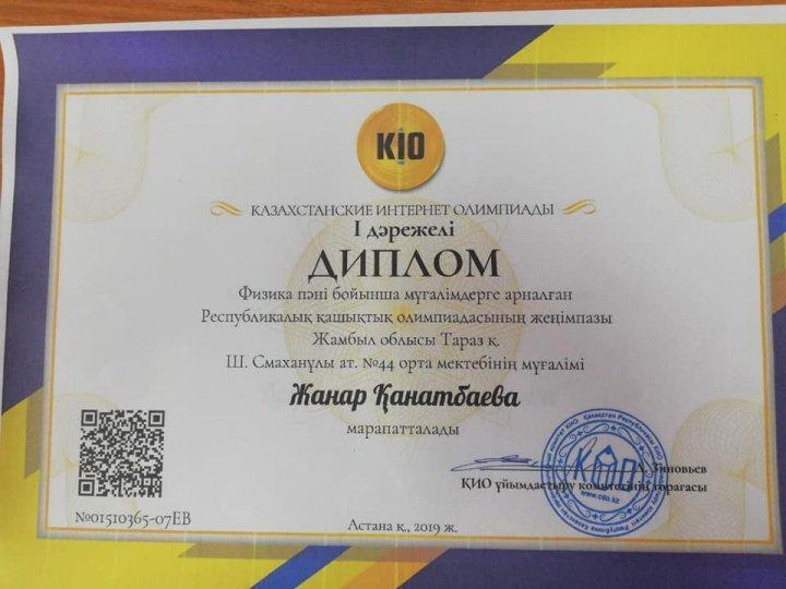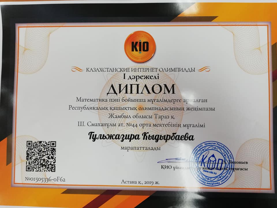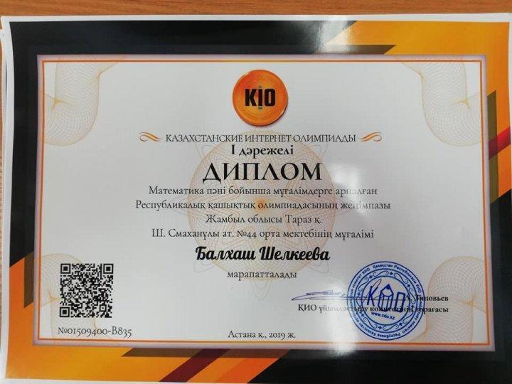 16 апрель 2019 100 1 2 3 4 5 Республикалық қашықтық интернет олимпиадасы (КИО) Ш.Смаханұлы атындағы №44 орта мектебінің математика және физика пәнінің мұғалімдері Республикалық қашықтық интернет олимпиадасынан (КИО) мұғалімдеріміз толағай табысқа жетіп, жүлделі орындарға ие болды. Әріптестерімізге тек жеңіс тілейміз!