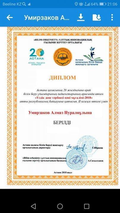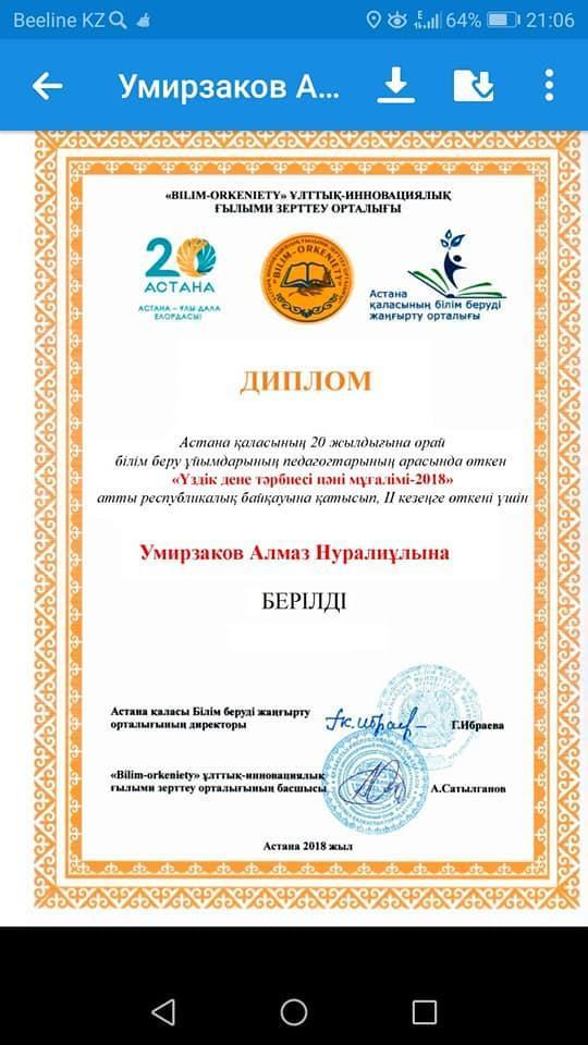 Биылғы оқу жылында Тараз қаласы Шона Смаханұлы атындағы №44 орта мектебінің дене шынықтыру пәнінің екінші санатты мұғалімі Умирзаков Алмаз Нұралыұлы ҚР "BILIM-Orkeniety" ұлттық инновациялық ғылыми-зерттеу орталығы Астананың 20жылдығына ұйымдастырған "Үздік дене шынықтыру мұғалімі -2018 төсбелгісімен марапатталды. Әріптесімізге алдағы уақыттарда да еңбегіне сәттілік тілейміз!