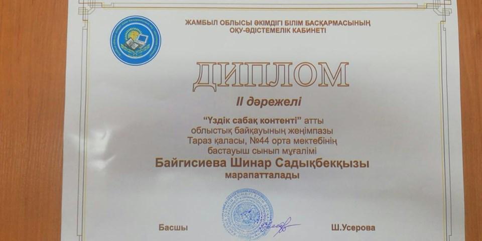 14 май 2019 100 1 2 3 4 5 Облыстық "ҮЗДІК САБАҚТЫҢ КОНТЕНТІ" байқауы Шона Смаханұлы атындағы №44 орта мектебінің бастауыш сынып мұғалімі педагог _сарапшы Байгисиева Шынар Садықбекқызы облыстық "ҮЗДІК САБАҚТЫҢ КОНТЕНТІ" байқауының ІІ дәрежелі дипломымен марапатталды. Құттықтаймыз!!!
