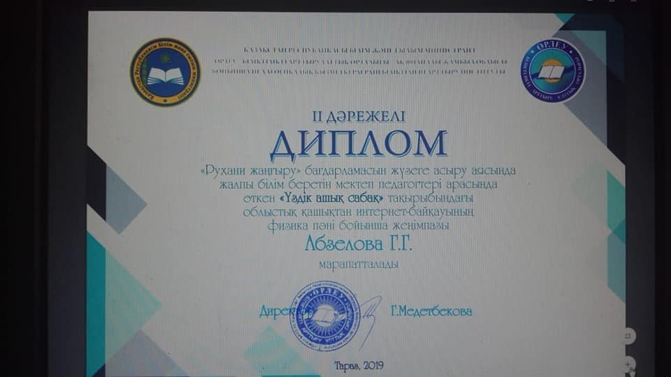 Шона Смаханұлы атындағы №44 орта мектебінің жоғары санатты ұстаздары Абзелова Г.Ғ және Шелкеева Б.Н. Рухани жаңғыру бағдарламасын жүзеге асыру аясында жалпы білім беретін мектеп педагогтары арасында өткен "ҮЗДІК АШЫҚ САБАҚ" тақырыбындағы облыстық қашықтықтан интернет байқауының физика жане математика пәндері бойынша жүлделі ІІ орынды иеленді. Құттықтаймыз.