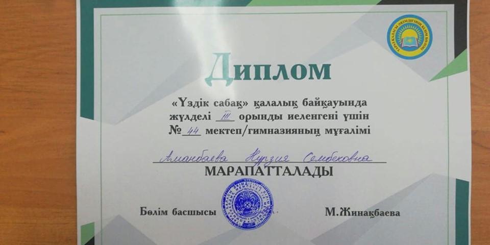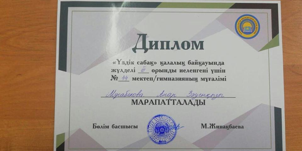 Шона Смаханұлы атындағы #44 орта мектебінің өзін-өзі тану пәнінің мұғалімі Мұсабекова Анар және бастауыш сынып мұғалімі Аманбаева Нурзия қалалық "ҮЗДІК САБАҚ" байқауында жүлделі ІІІ орындармен марапатталды. Құтты болсын әріптестер! Еңбектеріңізге шығармашылық табыстар тілейміз!