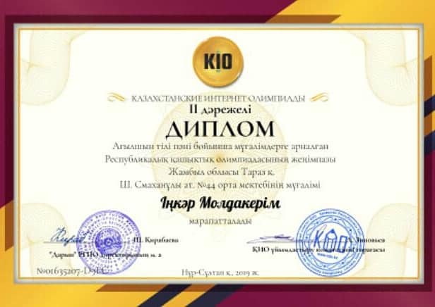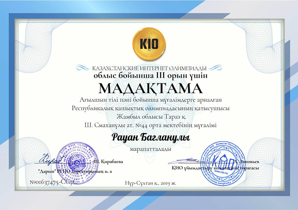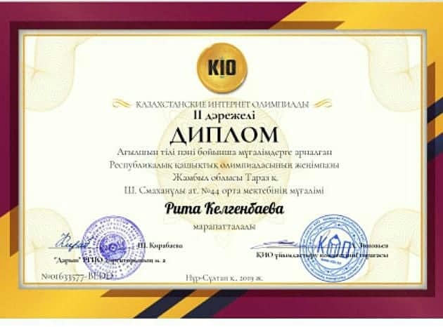29 октябрь 2019 0 1 2 3 4 5 РЕСПУБЛИКАЛЫҚ "КИО" олимпиадасы ағылшын тілі пәні РЕСПУБЛИКАЛЫҚ "КИО" олимпиадасынан мектебіміздің ағылшын тілі пәнінің мұғалімдері жүлделі орындарға ие болып, арнайы дипломдармен марапатталды.