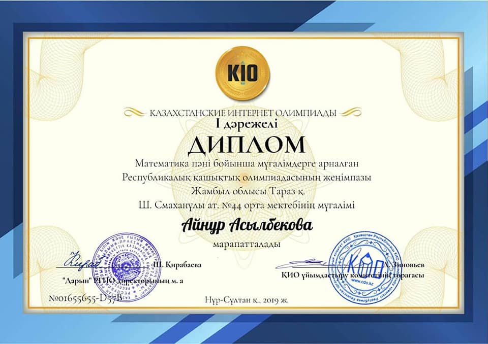 31 октябрь 2019 0 1 2 3 4 5 Республикалық "КИО" олимпиадасы математика пән мұғалімдері Мектебіміздің математика пән мұғалімдері Республикалық "КИО" олимпиадасынан жүлделі орындарға ие болды. Кұттықтаймыз