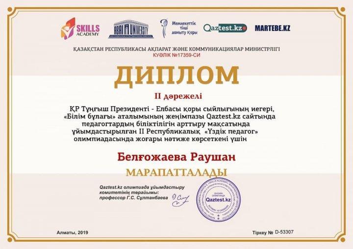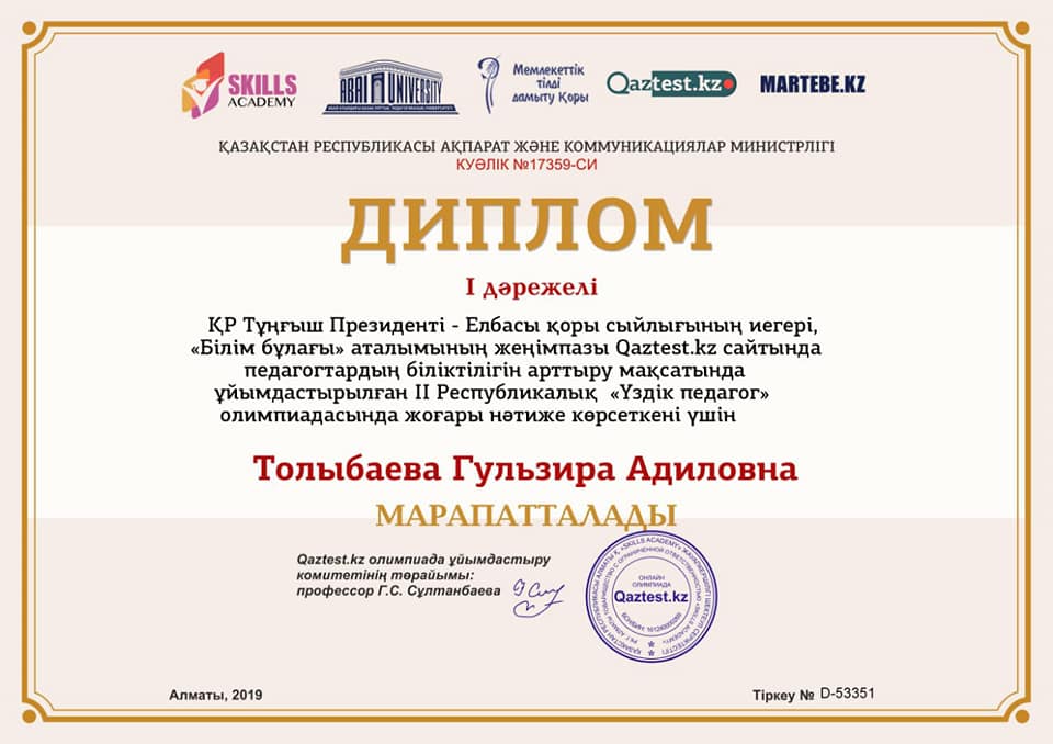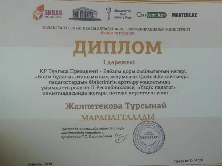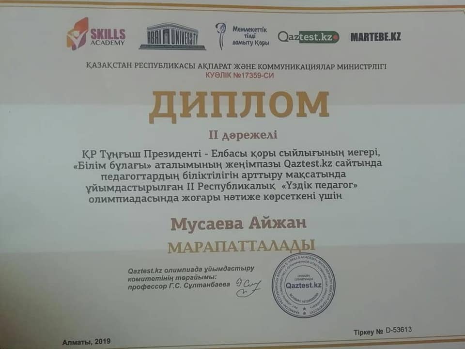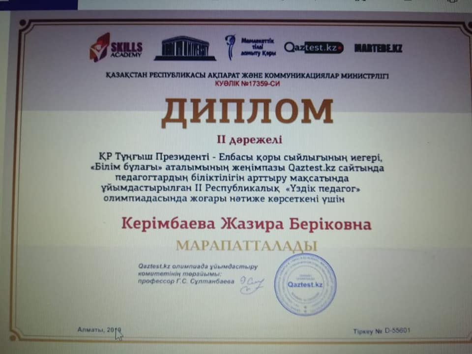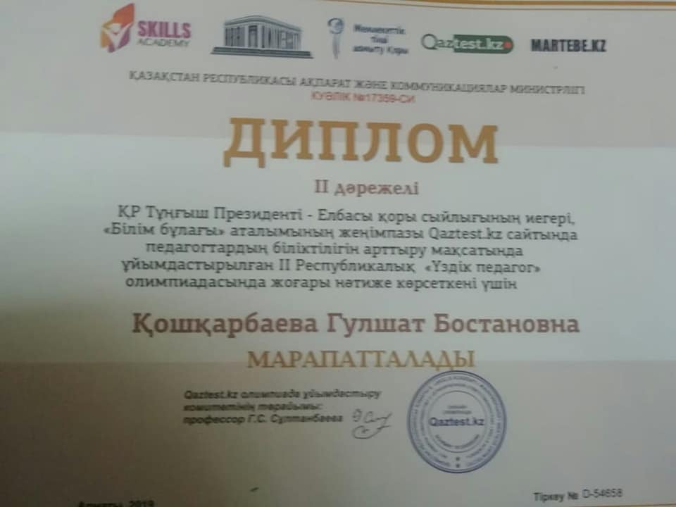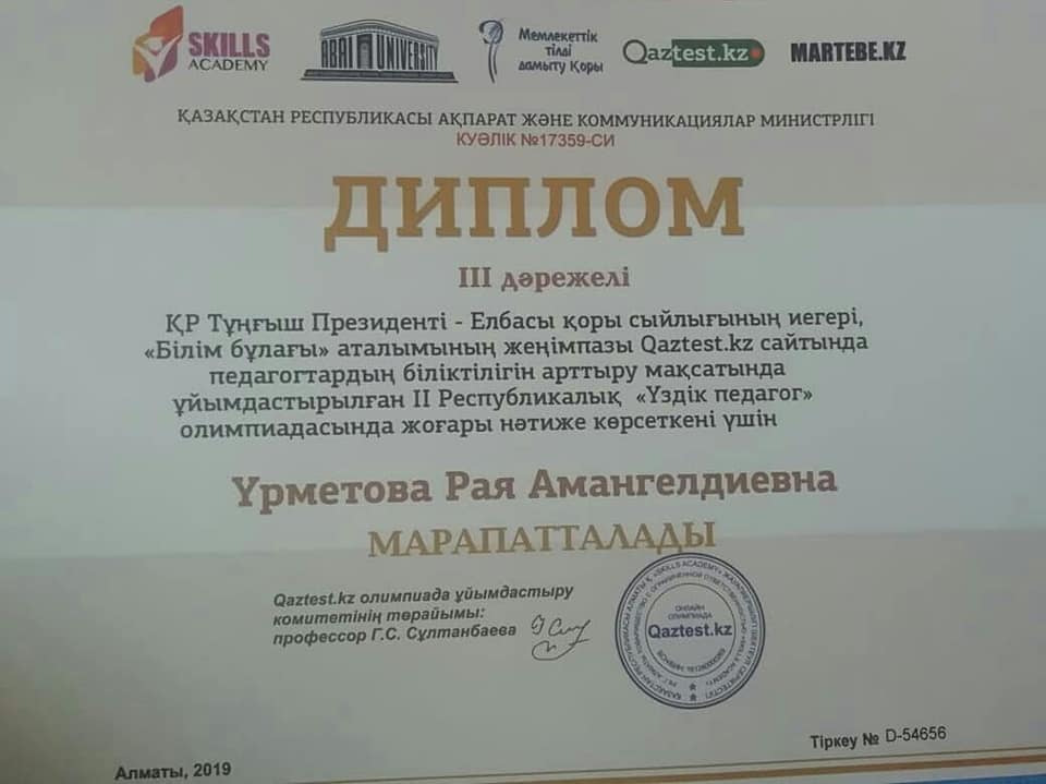 31 октябрь 2019 0 1 2 3 4 5 Республикалық "ҮЗДІК ПЕДАГОГ" олимпиадасы бастауыш сынып мұғалімдері Бастауыш сынып ұстаздары Республикалық "ҮЗДІК ПЕДАГОГ" олимпиадасынан жүлделі орындарға ие болды. Құттықтаймыз.