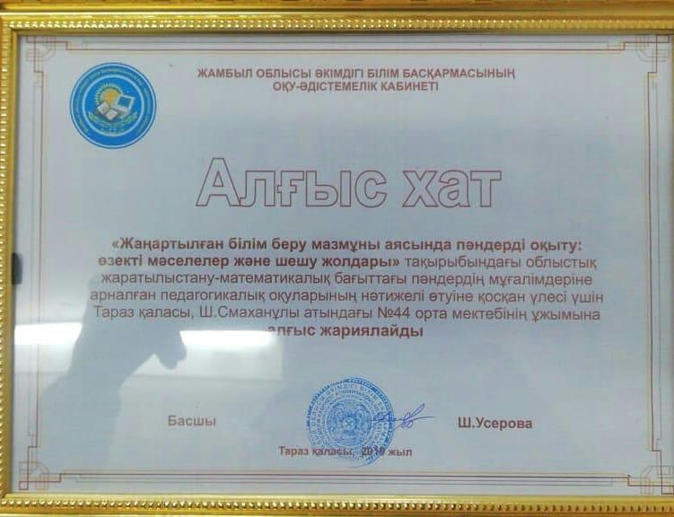 Жамбыл облысы әкімдігі білім басқармасының оқу әдістемелік кабинеті ұйымдастыруымен "ЖАҢАРТЫЛҒАН БІЛІМ БЕРУ МАЗМҰНЫ АЯСЫНДА ПӘНДЕРДІ ОҚЫТУ: ӨЗЕКТІ МӘСЕЛЕЛЕР ЖӘНЕ ШЕШУ ЖОЛДАРЫ" атты педагогикалық оқуларында мектебіміз облыстық білім басқармасының оқу әдістемелік кабинетінің арнайы АЛҒЫС ХАТЫМЕН МАРАПАТТАЛДЫ.