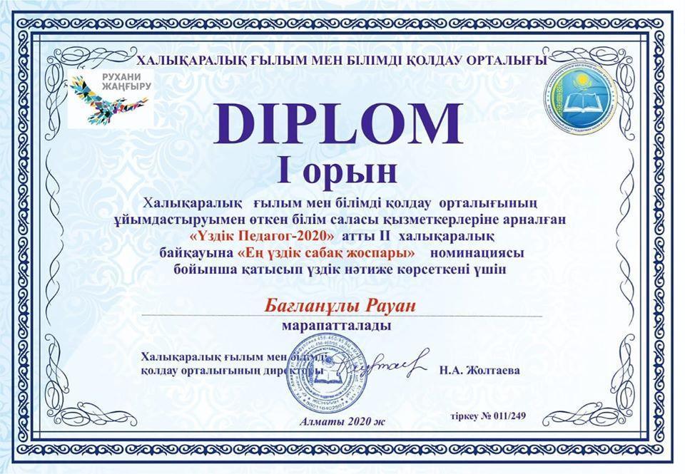 Халықаралық ғылым мен білімді қолдау орталығының ұйымдастырумен өткен білім саласының қызметкерлеріне арналған "ҮЗДІК ПЕДАГОГ-2020" атты ІІ халықаралық байқауына "ЕҢ ҮЗДІК САБАҚ ЖОСПАРЫ" номинациясы бойынша қатысып, үздік нәтиже көрсеткені үшін мектебіміздің ағылшын тілі пәнінің мұғалімі, педагог-модератор Бағланұлы Рауан жүлделі І орын Дипломымен марапатталды.