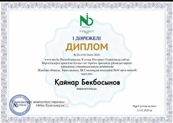 Республикалық NIO онлайн олимпиадасының жеңімпазы атанған тарих пәнінің мұғалімі Бекбосынов Қайнар Асанкуловты І орын және ІІ орын жүлдесімен құттықтаймыз!!! Жеңісіңіз құтты болсын