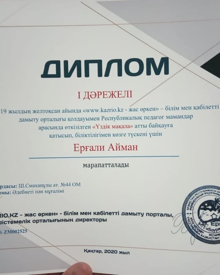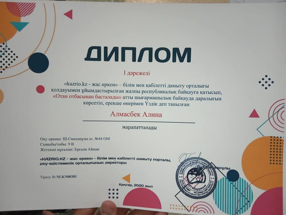 Республикалық "KAZRIO" сайтында ұйымдастырылып өткізілген "ОТАН ОТБАСЫНАН БАСТАЛАДЫ" атты шығармашылық байқауда І дәрежелі дипломмен марапатталған мектебіміздің 9-В сынып білім алушысы Алмасбек Алинаны құттықтаймыз. Жетекшісі: қазақ тілі мен әдебиеті пәнінің жоғары санатты мұғалімі Ерғали Айман Ерғалиқызы. Жеңістеріңіз құтты болсын!!!