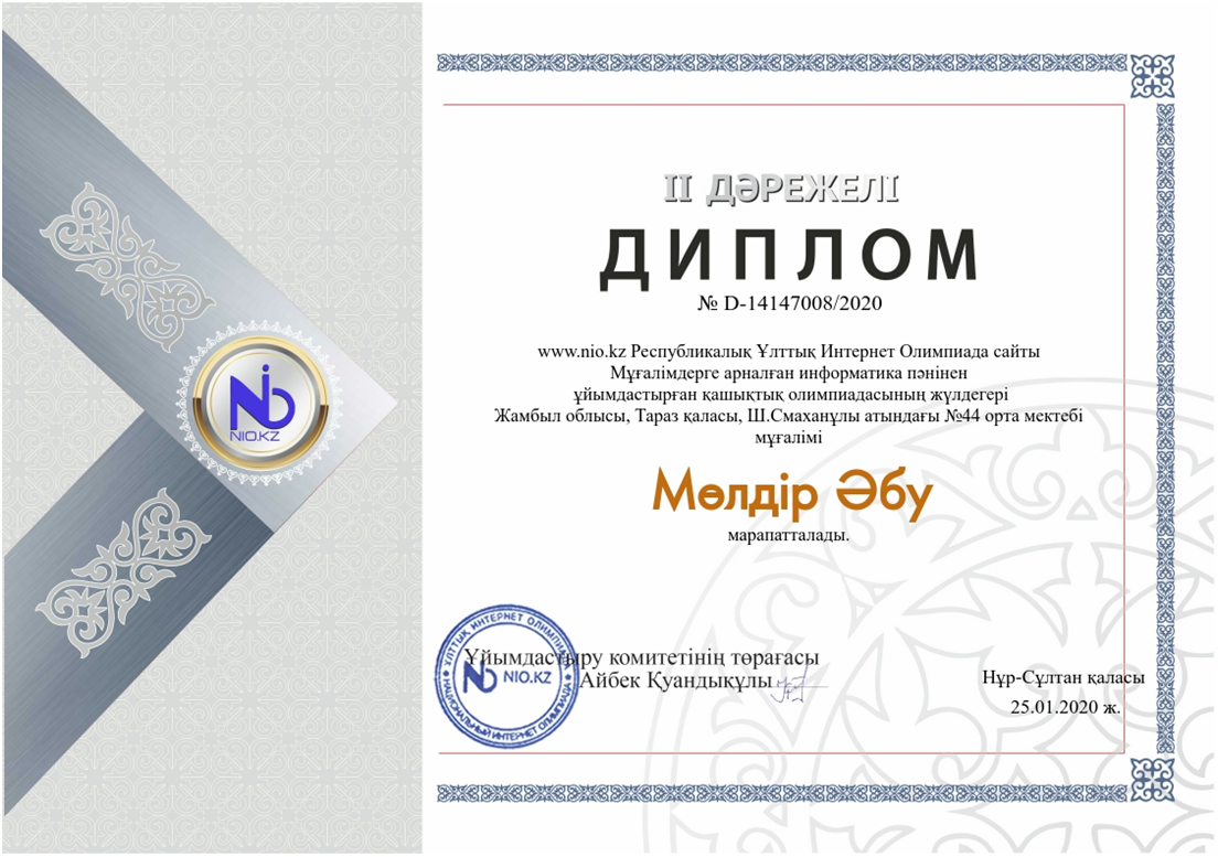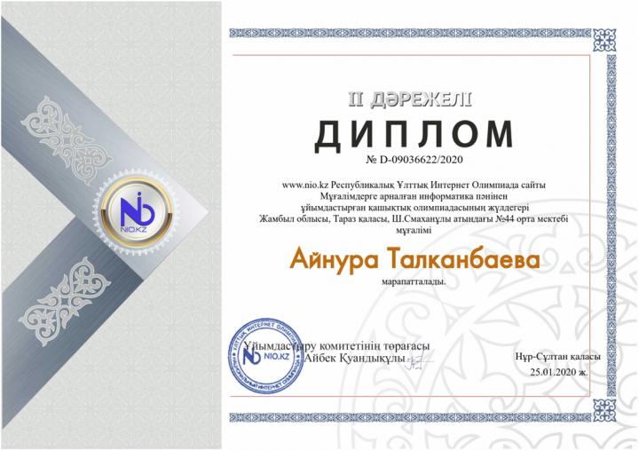 Республикалық NIO онлайн олимпиадасының жеңімпазы атанған информатика пәнінің мұғалімі Талқанбаева Айнұрды ІІ орын жүлдесімен, Әбу Мөлдірді ІІ орын жүлдесімен құттықтаймыз!!! Жеңісіңіз құтты болсын