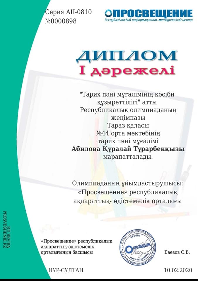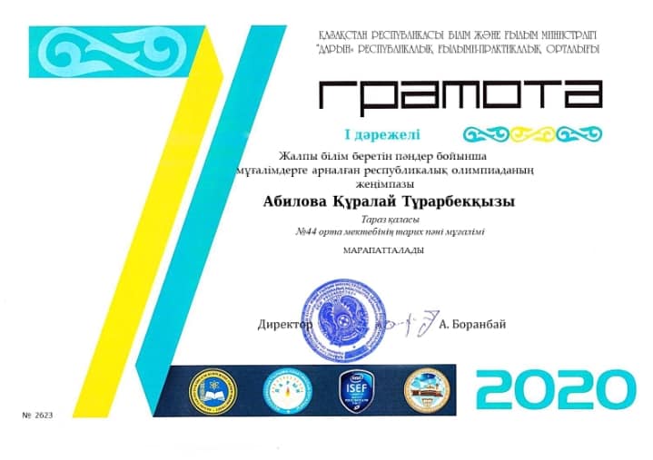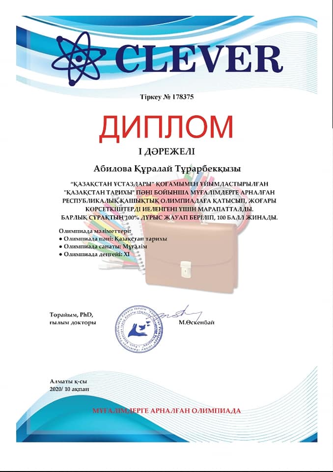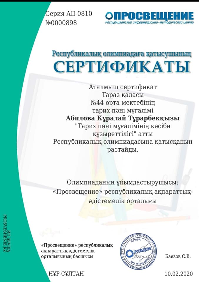 12 февраль 2020 0 1 2 3 4 5 Тарих пәнінен өткен республикалық қашықтық олимпиадасы Мектебіміздің тарих пәнінің мұғалімі Абилова Құралай тарих пәнінен өткен республикалық қашықтық олимпиадалардан жүлделі орындар иеленді.