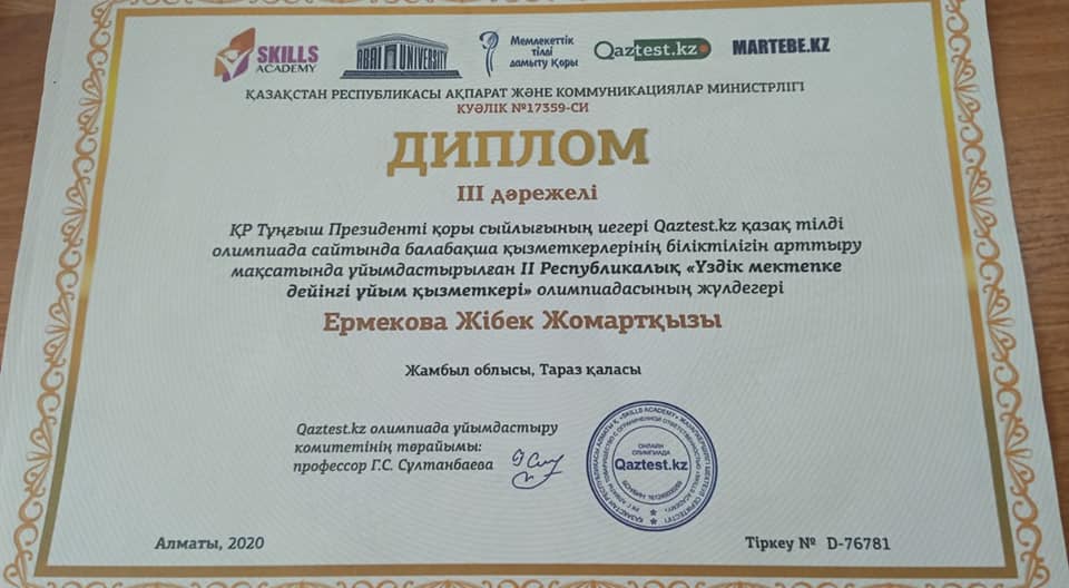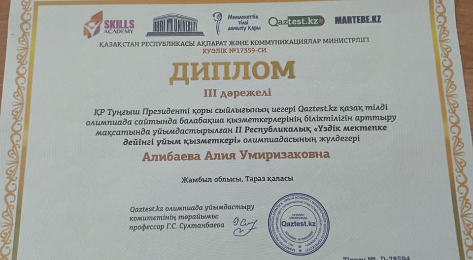 ІІ республикалық "Qaztest" сайтында өткен "ҮЗДІК МЕКТЕПКЕ ДЕЙІНГІ ҰЙЫМ ҚЫЗМЕТКЕРІ" олимпиадасынан мектеп алды даярлық тобының мұғалімдері Алибаева Алия Қаржаулова Алтынай Ермекова Жібек жүлделі І орын иеленді.
