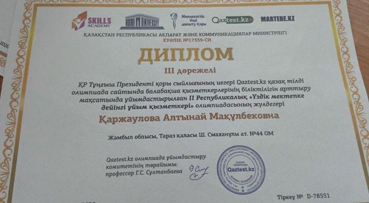 СШ №44 » Біз туралы » Жетістіктеріміз » ІІ республикалық "Qaztest" сайтында өткен "ҮЗДІК МЕКТЕПКЕ ДЕЙІНГІ ҰЙЫМ ҚЫЗМЕТКЕРІ" олимпиадасы мектеп алды даярлық тобының мұғалімдері