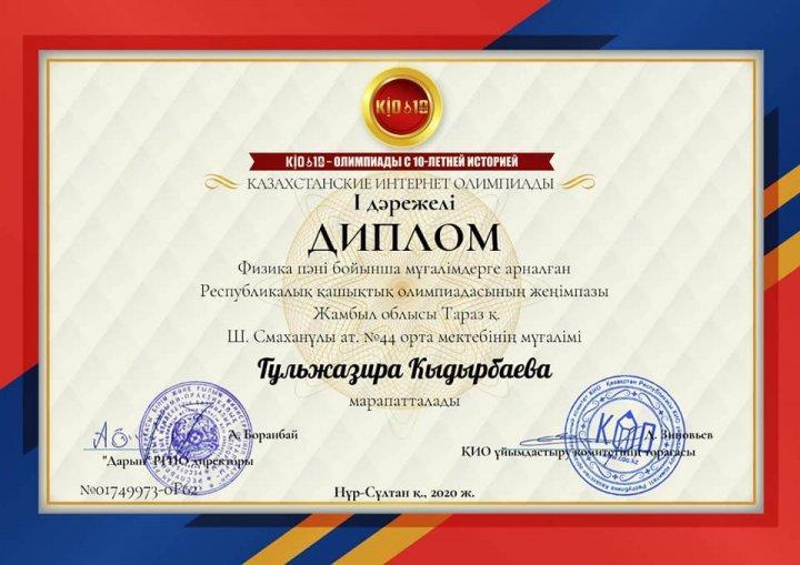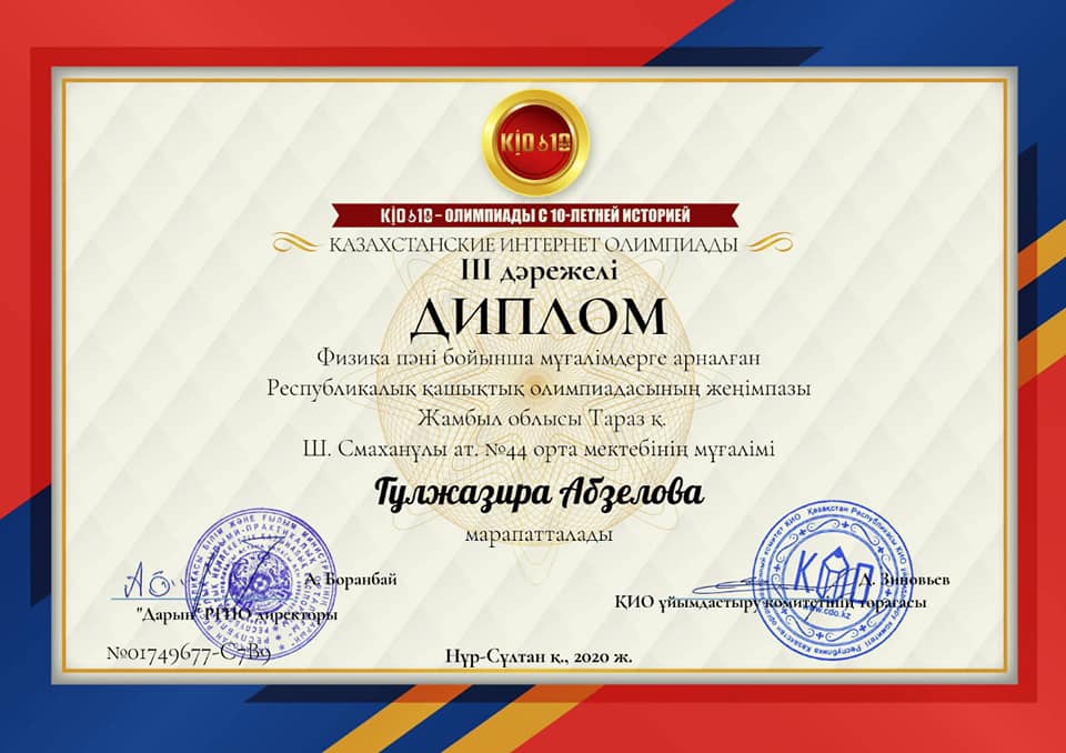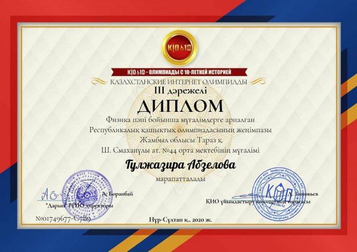 27 февраль 2020 0 1 2 3 4 5 Республикалық "КИО" қашықтық олимпиадасы физика пәнінің мұғалімдері Республикалық "КИО" қашықтық олимпиадасынан мектебіміздің физика пәнінің мұғалімдеріКыдырбаева Гүлжазира- І орынАбзелова Гүлжазира- ІІІ орын иеленді.