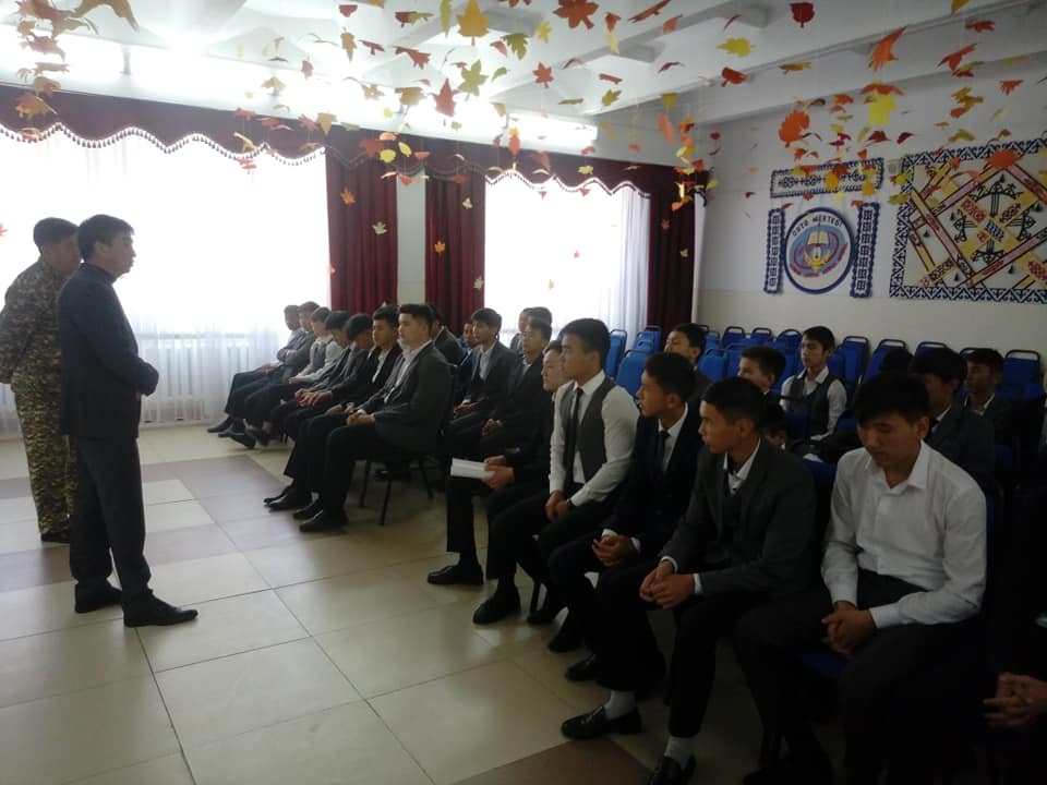 25.10.2019 ж мектеп директорының кұқықтық ісі жөніндегі орынбасары Қуандықов Алмат Есенкулович мектептің ұл балалары арасында құқық бұзушылықтардың алдын алу жөнінде түсіндіру жұмыстарын жүргізді. Сонымен қатар ұлдар жиналысында сабақ уақытында мешіттерге ата аналарының немесе заңды өкілдердің қарауынсыз бармау, күзгі демалыс кезінде құқық бузушылықтарға жол бермеу және т. б. мәселелер қарастырылды.
