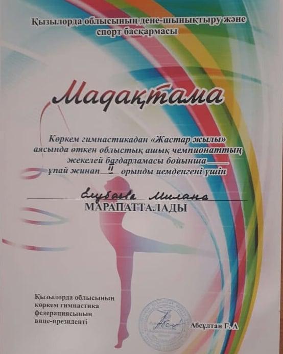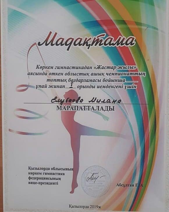 Қызылорда қаласында өткен "Жастар жылы" аясында көркем гинастикадан өткізілген біріншілікте жүлделі 2 орынды иеленген облысымыздың атынан қатысқан Шона Смаханұлы атындағы №44 орта мектебінің 5-Б сынып оқушысы Елубаева Милана марапатталады.Сынып жетекшісі: Шарипбаева Макпал