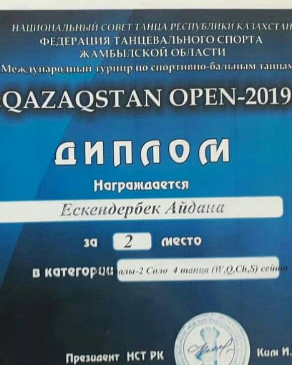 18 октябрь 2019 0 1 2 3 4 5 Ескендірбек Айдана халықаралық би турнирінің жеңімпазы 5-А сынып оқушысы Ескендірбек Айдана халықаралық би турнирінің жеңімпазы. Сынып жетекшісі: Кенжебекова Ақмарал. Құттықтаймыз!!!