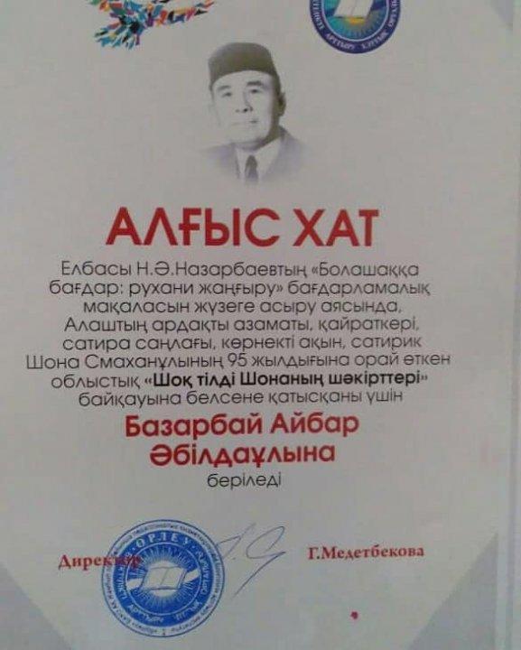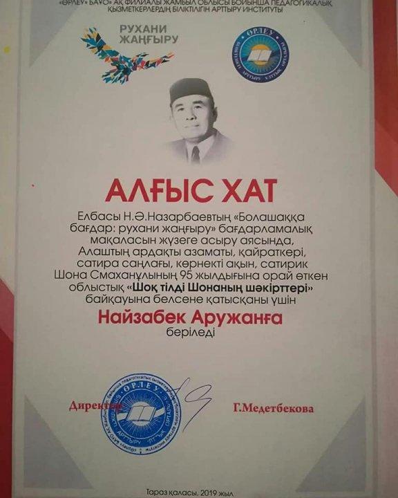 Облыстық "Шоқ тілді Шонаның шәкірттері " атты байқауға белсене қатысқаны үшін Тараз қаласы Шона Смаханұлы атындағы № 44 орта мектебінің оқушылары Базарбай Айбар мен Найзабек Аружан арнайы алғыс хатпен марапаттылып, сынып жетекшілері Керімбай Жазира мен Өзбекова Айгерімде арнайы алғыс хатпен мараптталды.