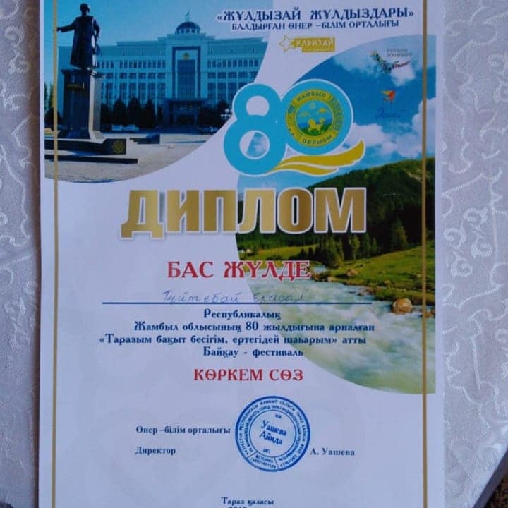 Жамбыл облысының 80 жылдығына арналған "ТАРАЗЫМ БАҚЫТ БЕСІГІМ, ЕРТЕГІДЕЙ ШАһАРЫМ" атты республикалық Республикалық "КӨРКЕМ СӨЗ" байқау-фестивальінде Шона Смаханұлы атындағы №44 орта мектебінің 6-Г сынып білім алушысы, біздің дарынды, талантты оқушымыз ТҮЙТЕБАЙ ЕРАСЫЛ бас жүлдені иеленіп отыр! Құттықтаймыз!!! Өнерің өрге жүзіп, алар асуларың көп болсын Ерасыл!!!!