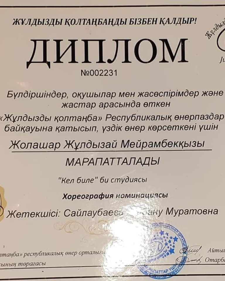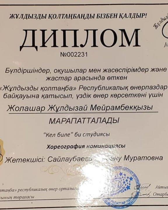 17 январь 2020 0 1 2 3 4 5 Республикалық "Жұлдызды қолтаңба" Республикалық "Жұлдызды қолтаңба" атты бүлдіршіндер, оқушылар мен жасөспірімдер және жас өнерпаздар байқауына қатысып жүлделі І орынды иеленген мектебіміздің 4-В сынып білім алушысы Жолашар Жұлдызай Мейрамбекқызын құттықтаймыз!!!