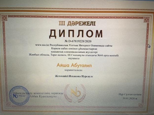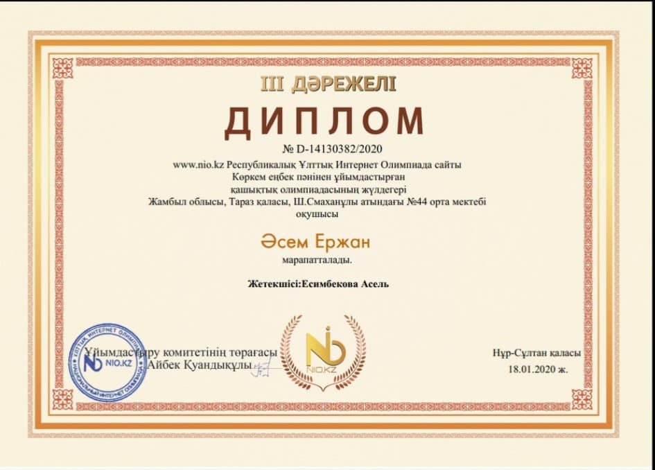 21 январь 2020 0 1 2 3 4 5 Республикалық NIO онлайн олимпиадасының жеңімпазы Республикалық NIO онлайн олимпиадасының жеңімпаздары көркем еңбек пәні