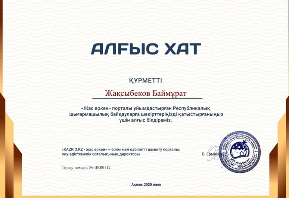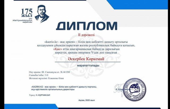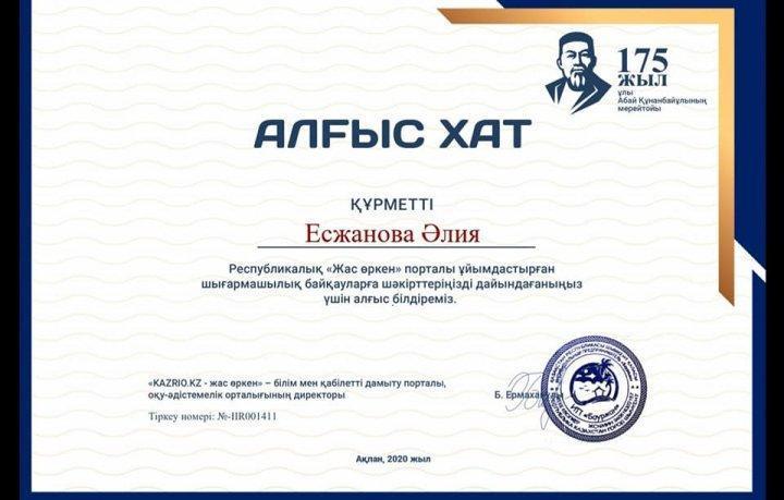 "КАZRIO-жас өркен" білім мен қабілетті дамыту орталығы ұйымдастырған "АБАЙДЫҢ ҚАРА СӨЗДЕРІ" байқауында үздік деп танылған мектебіміздің 3Ә сынып оқушылары Түйтебай Инабатты және Әскербек Көркемайды құттықтаймыз!!! Байқауға шәкірттерін дайындап, үлес қосқаны үшін жетекшісі Есжанова Алия және мектеп директоры Жақсыбеков Баймұрат Жақсыбекұлына "Алғыс хат" берілді.