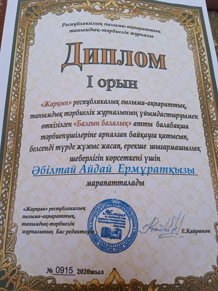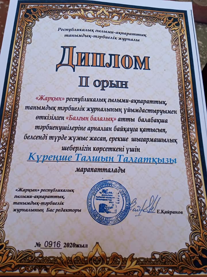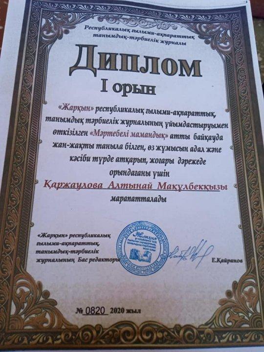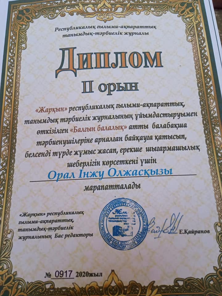 19 февраль 2020 0 1 2 3 4 5 Республикалық "МӘРТЕБЕЛІ МАМАНДЫҚ" байқауы Республикалық "МӘРТЕБЕЛІ МАМАНДЫҚ" байқауында мектеп алды даярлық тобының мұғалімі Қаржаулова Алтынай І орын және шәкірттері Әбілтай Айдай, Күреңше Талшын, Орал Інжу жүлделі І және ІІ орын иеленді.