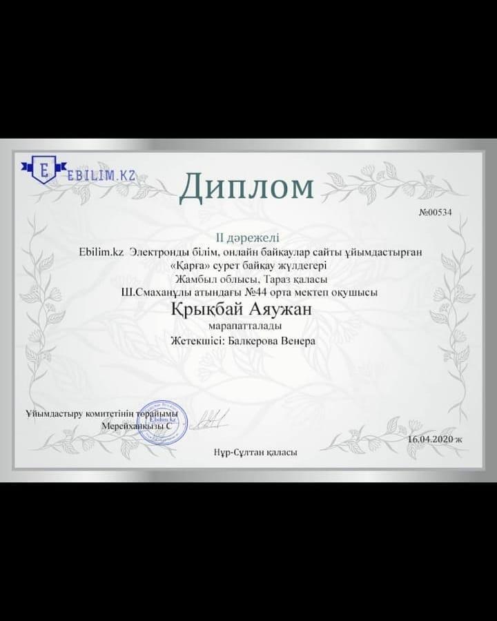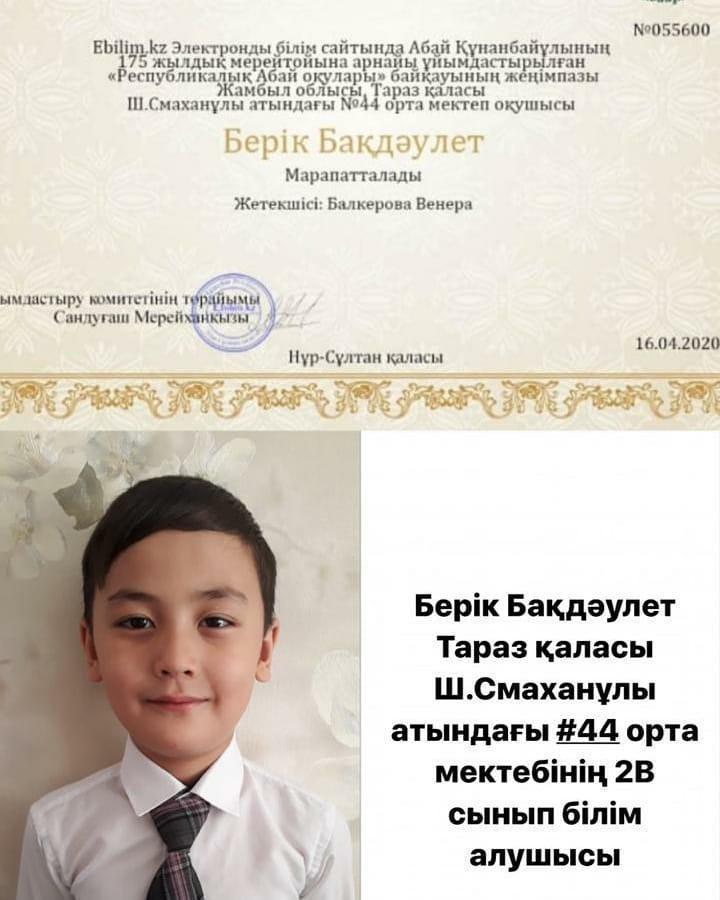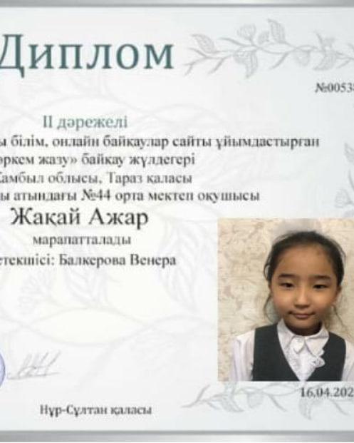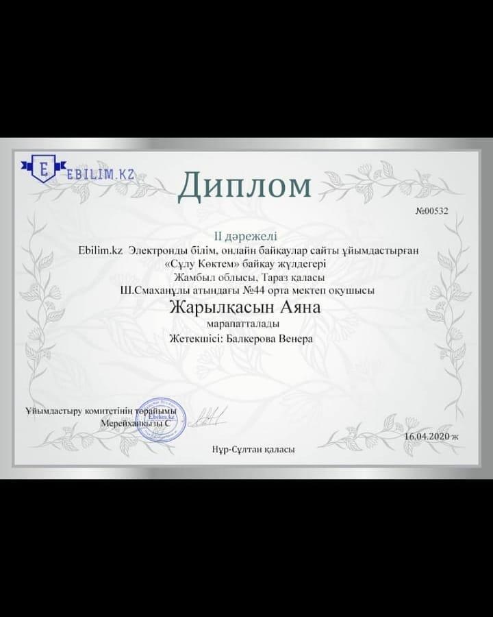 Тараз қаласы Шона Смаханұлы атындағы №44 орта мектебінің 2-В сынып білім алушылары республикалық қашықтықтан өткен байқаулардан жүлделі орындар алды.
