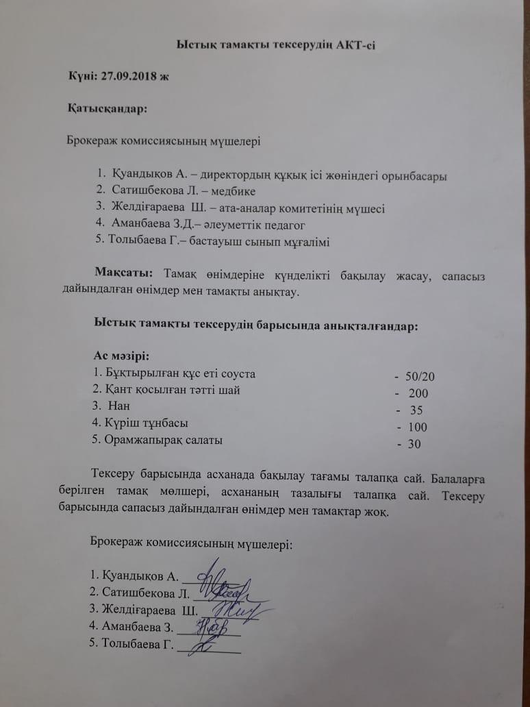 » » » Ыстық тамақты тексерудің актісі 27.09.2018ж