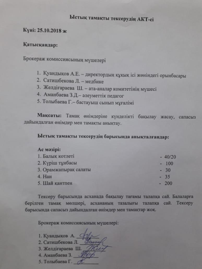 » » » Ыстық тамақты тексерудің актісі 25.10.2018ж
