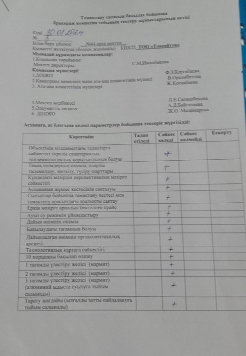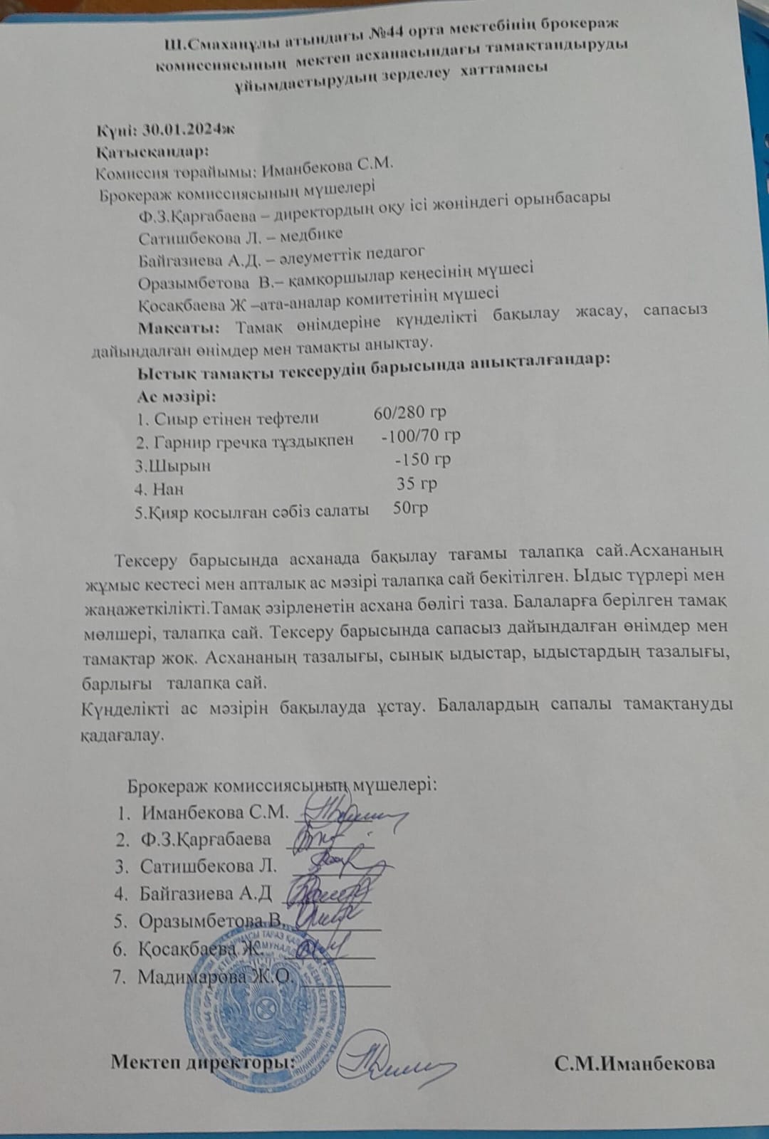 30 январь 2024 0 1 2 3 4 5 Брокераж 30.01.2024 оқу жылында Шона Смахан ұлы атындағы №44 орта мектепте Брокераж комиссиясы асхананытексеру барысы